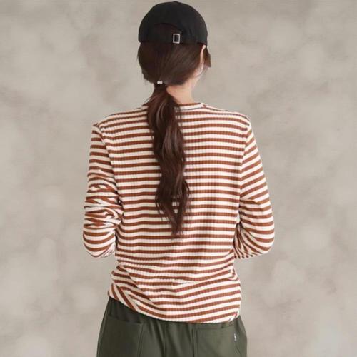 [옷자락] 여성용 일상 스트라이프 엠보 라운드넥 긴팔 티셔츠