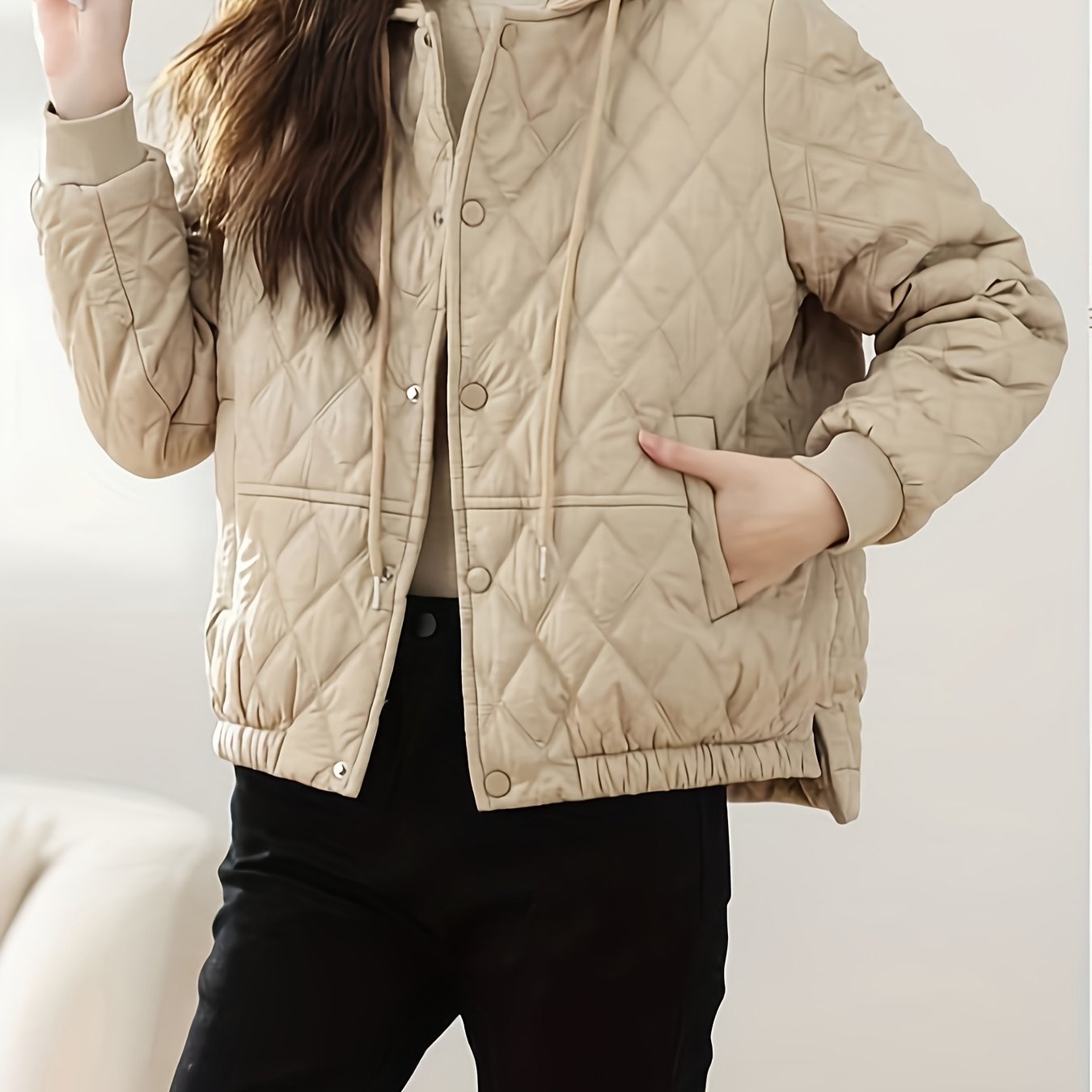 TEMU 여성용 경량 후드 퀼트 재킷 - 포켓이 있는 스타일리시한 블랙 겨울 코트, 긴 소매 및 버튼 디테일, 가을/겨울 야외 캐주얼 착용 및 캐주얼 의상, 여성용 겨울 코트, 여성용 플리스 겨울 재킷, 여성용 겨울 코트
