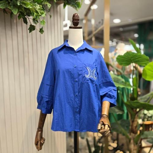 [옷자락]여성 여름 블라우스 꽃무늬 자수 포켓 롤업 셔츠 파란색