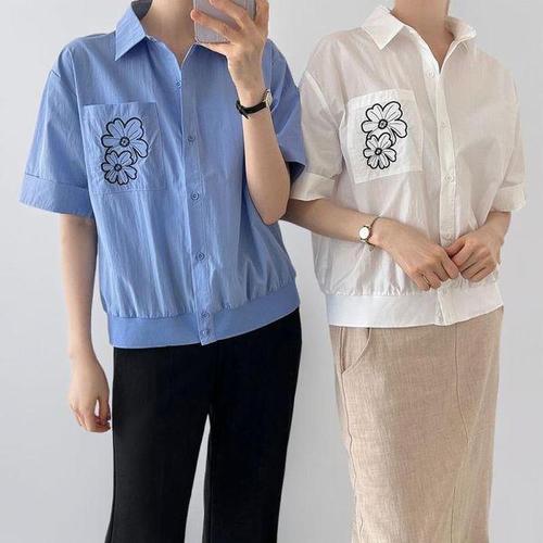 [옷자락]여성 여름 플라워 자수 포켓 롤업 셔츠