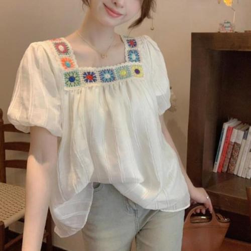 [옷자락]여자 벌룬 클래식 썸머 스퀘어넥 자수레이스 블라우스