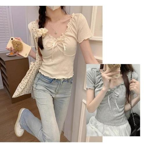 미즈큐즈 / 핀탁 리본 반팔 셔링 주름 크롭 여름 블라우스 여성
