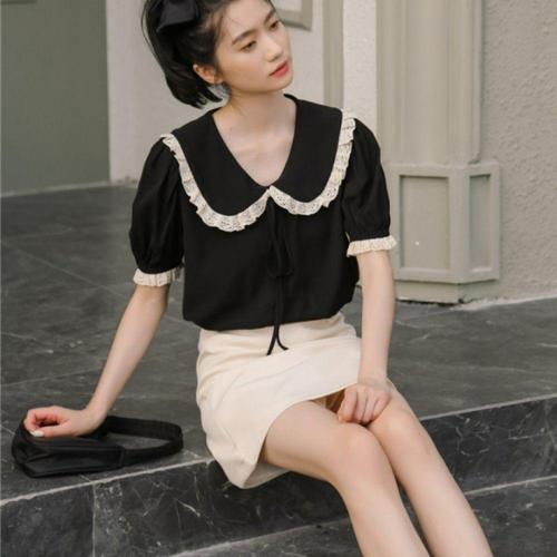 여성 쉬폰 리본 반팔 블라우스 여름 레이스 카라 프릴 블라우스 WFLHZ7O