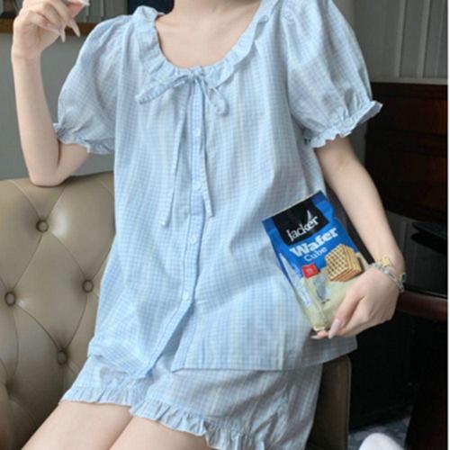 리본 셔링 반팔 블라우스 반바지 여름 잠옷 세트 WFMRL4Q