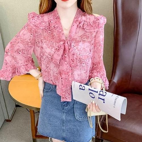 [엄지척]여성 여름 핑크 리본 러플 7부 소매 쉬폰 블라우스_19642964_667501