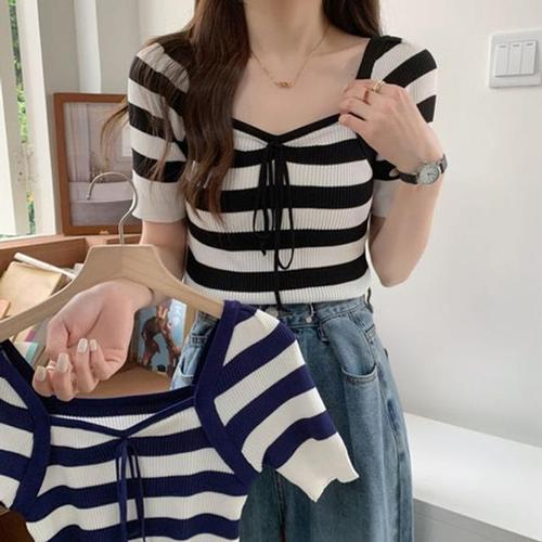 [셀러허브_여성트랜드패션]ONM 기본 여성티셔츠 스퀘어넥 리본 여름 반팔니트