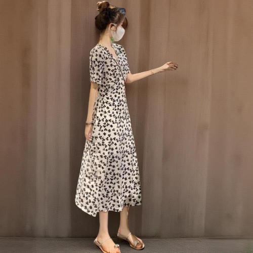 [옷자락] 여성 사랑스러운 무늬 리본 허리띠 브이넥 반팔 롱 드레스