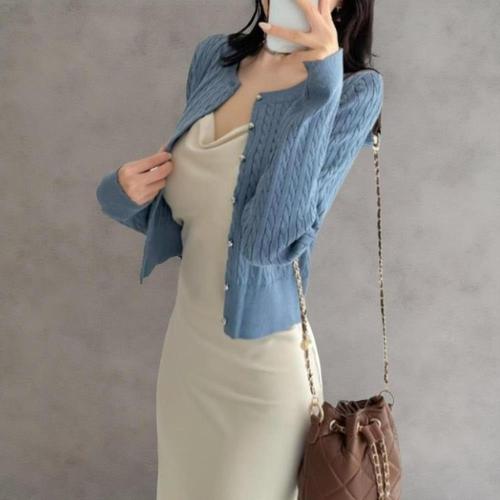 [옷자락]여성 클래식 꼬임 케이블 무지 반팔 가디건