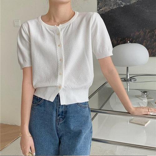 여성 화이트 반팔 가디건 니트 라운드 데일리 WFKQ94T