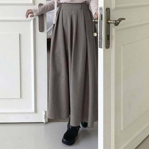 [옷자락] 여성용 핀턱 플레어 스웨이드 롱 허리밴드 스커트