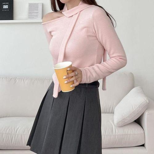 여자 오프숄더 연분홍 봄티 사선 넥타이 티셔츠