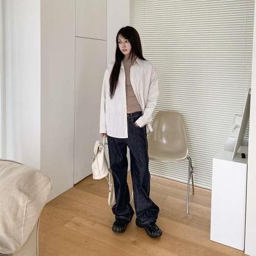 [신상오픈런]여성용 루즈핏 긴팔 카라넥 스트라이프 코튼 셔츠
