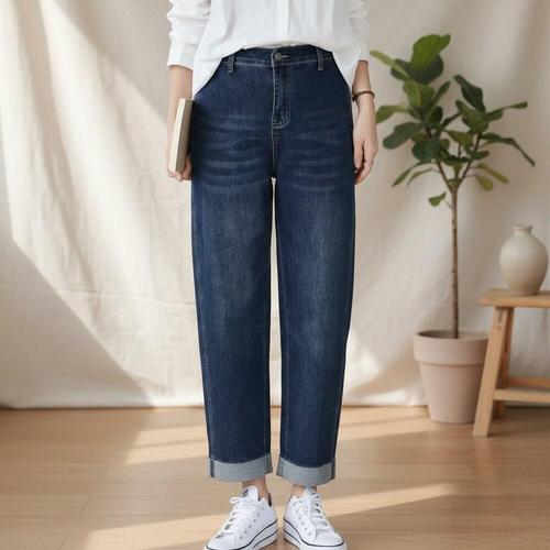 DEARHUA 여성 빈티지 배기 9부 팬시 청바지 봄 가을 날씬해보이는 허리편한 하이웨이스트 커브드 기본형 일상 롱기장 세미 편안한 연 학생 패션 디자인 간절기 코디 데님 팬츠