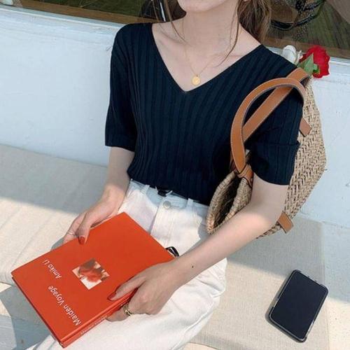 [에이치플러스몰]반팔 티 셔츠 크림 여름 쿨 여성 브이넥 니트