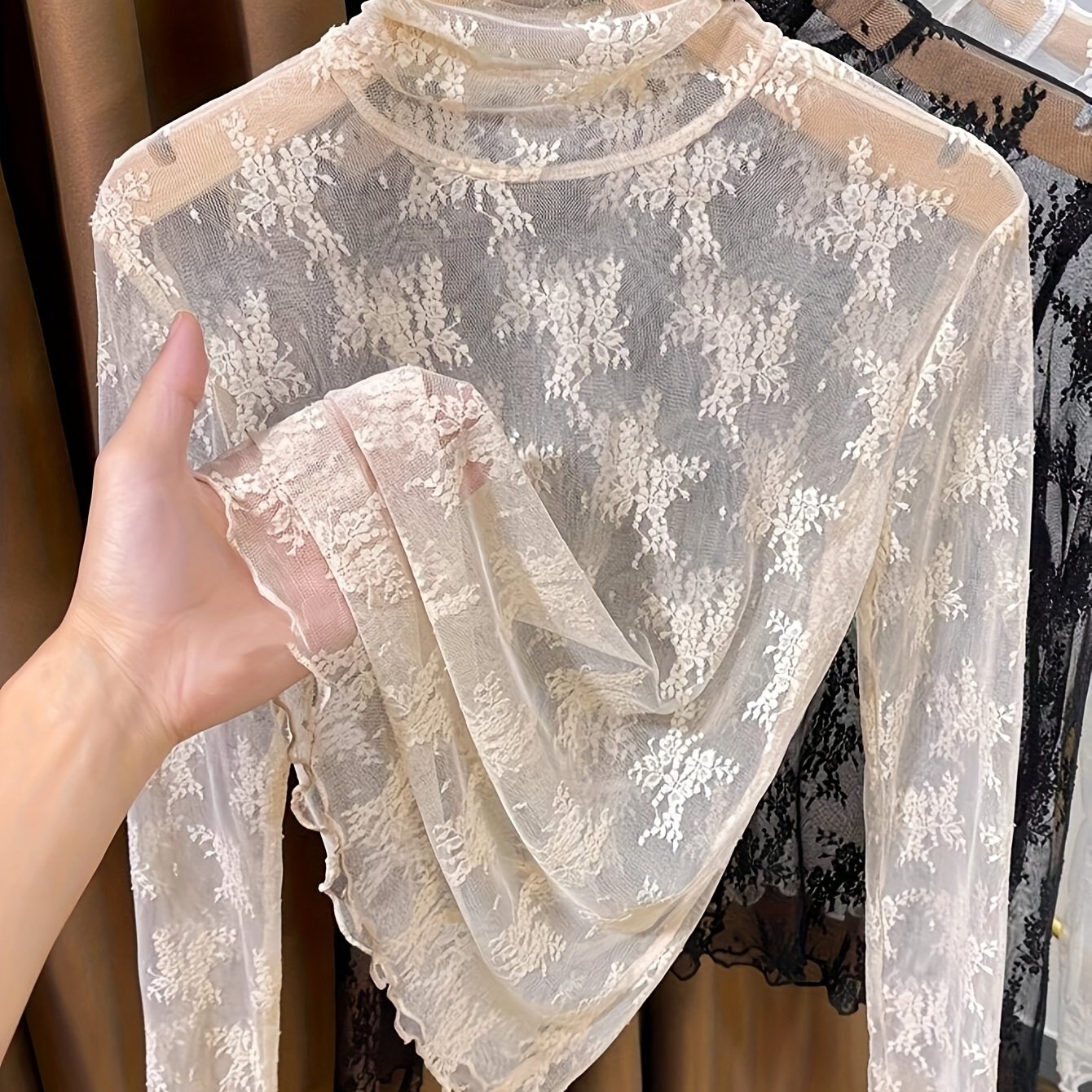 TEMU 여성 레이스 하이넥 긴팔 베이스 레이어 탑, 우아하고 섬세함.