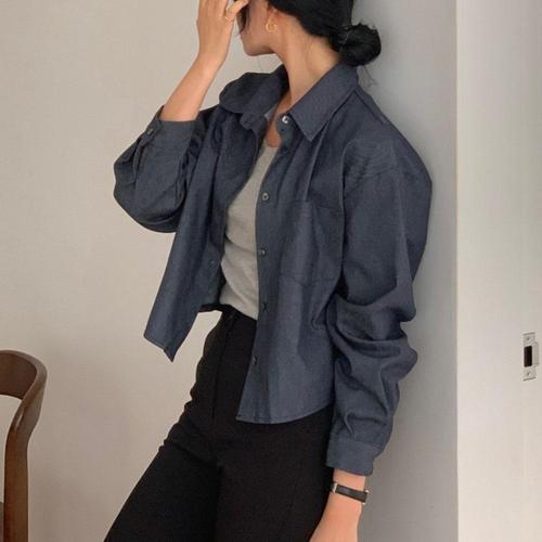 [문에이블]문에이블 여자 여성 가을 봄 간절기 아우터 세미크롭 데일리룩 청남방 데님 셔츠