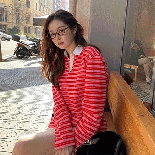 [르뚜앙]리야드 스트라이프 카라 긴팔 티셔츠 데일리 캐주얼 꾸안꾸 봄 가을 간절기 루즈핏 단가라 레이..