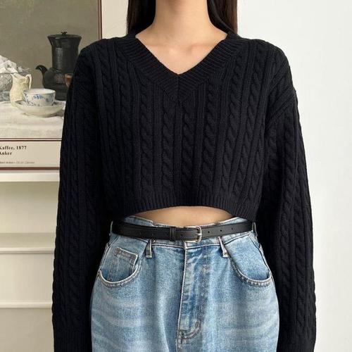 [다잇템]여자 꽈배기 롱슬리브 V넥 크롭티 FW 니트 (11097941A)