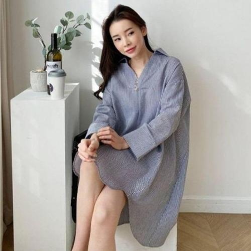 스트라이프 롱셔츠 원피스 베이직 밑단 절개 카라넥 WEE92AD