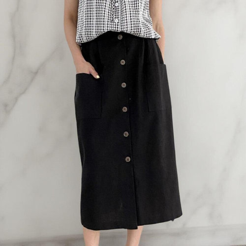 [옷자락] 여성 빈티지 린넨 부드러운 솔리드 버튼 롱 스커트