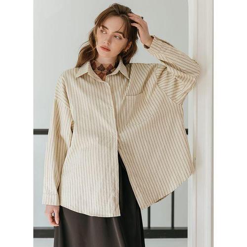 [옷자락]여자 데일리 루즈핏 스트라이프 배색 긴팔 카라 셔츠