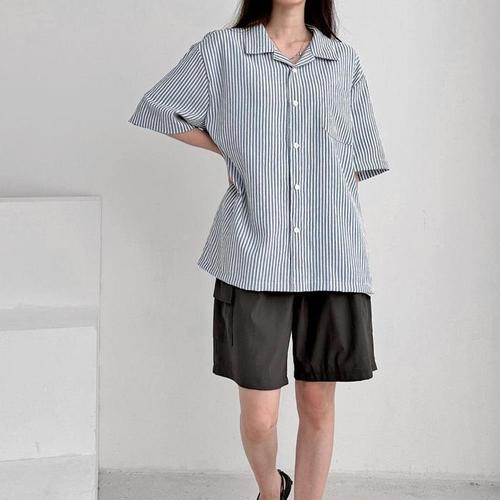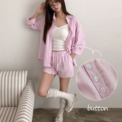 더핑크 / 니파 루즈핏 스트라이프 셔츠 + 밴딩 숏 팬츠 set