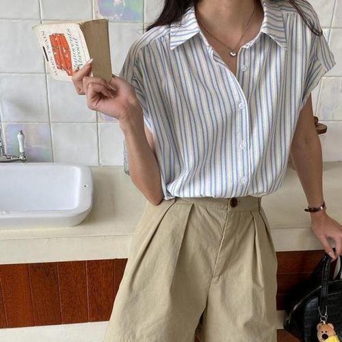 [에이치플러스몰]클린 스트라이프 반팔 셔츠 블라우스