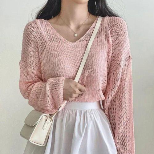 WL 여성 브이넥 봄 여름 긴팔 그물 망사 니트 티 핑크 WFLOG0G