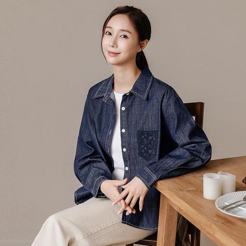 드리다 봄 가을 레이스 크롭 빅사이즈 데님 셔츠 청남방 40-50대 미시 엄마옷 캐주얼 출근 모임