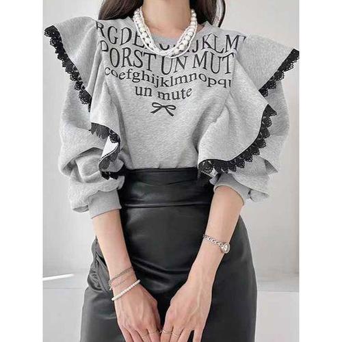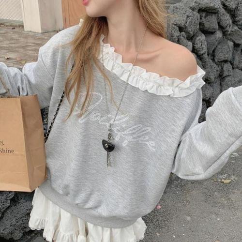 [에이치플러스몰]여성 간절기 원숄더 레이스 프릴 넥라인 레터링 맨투맨