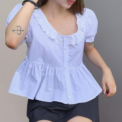 [옷자락]여자 지지미 프릴 퍼프반팔 버튼 카라넥 셔츠 블라우스