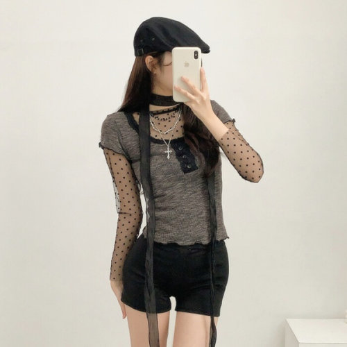 입꼬 / 시스루스카프set 레이스 헨리넥 반팔티셔츠4color