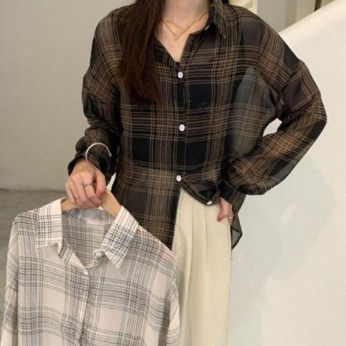 [다잇템_패션]여성 키치무드 남방 칠부 격자 박시 남방