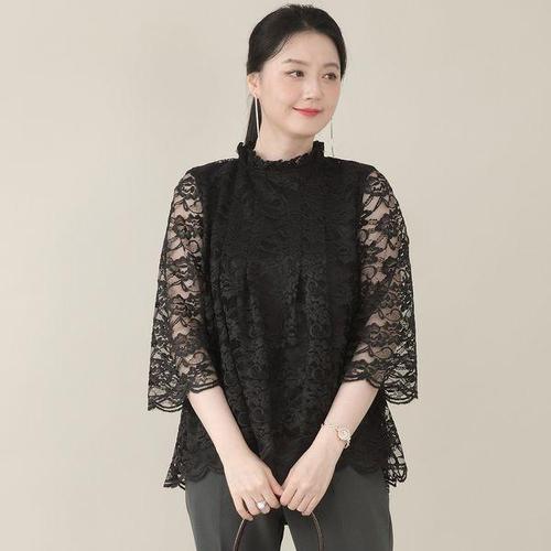 [애비뉴투지]엄마옷 스칼럽 레이스 루즈핏 A라인 하이넥 여성 봄 가을 시스루 칠부 블라우스 B10518