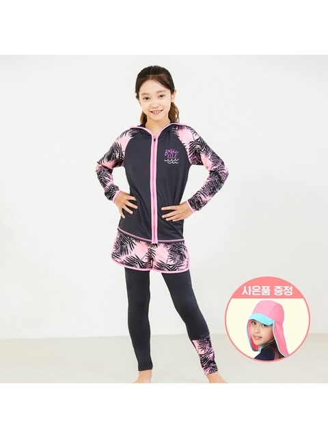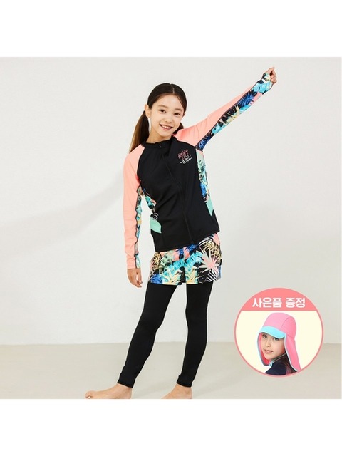 [리틀맘]초등학생 주니어 여아 수영복 집업 긴팔 래쉬가드 세트 3PCS 워터레깅스 생존수영