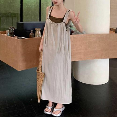 여름 여성용 패션 민소매 멜빵 롱원피스 데일리 심플 루즈핏 허리조임 캐주얼 편한 치마