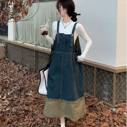 여자 봄 여름 가을 겨울 뷔스티에 멜빵 데님 롱원피스 핏이 예쁜 간절기 나들이룩