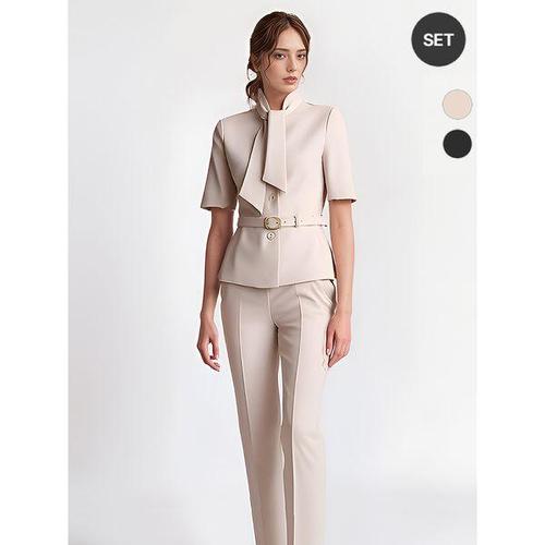 [비비드시크릿가너]SET 여성 타이넥 여름 벨티드 정장 자켓+팬츠 세트