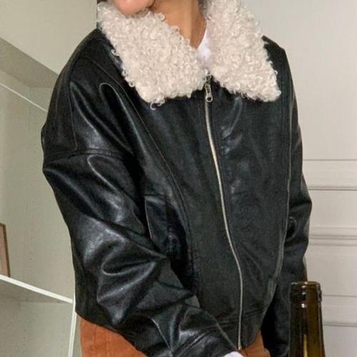 [옷자락]여자 가죽 트렌디 레더 FW 검정 바이크 카라넥 자켓