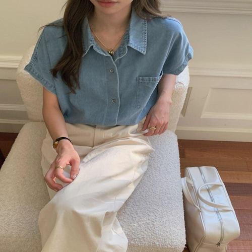 데님 여자 캐주얼 청남방 블라우스 2 루즈핏 반팔셔츠 WFKBWWI