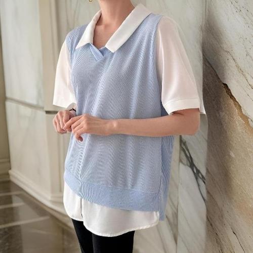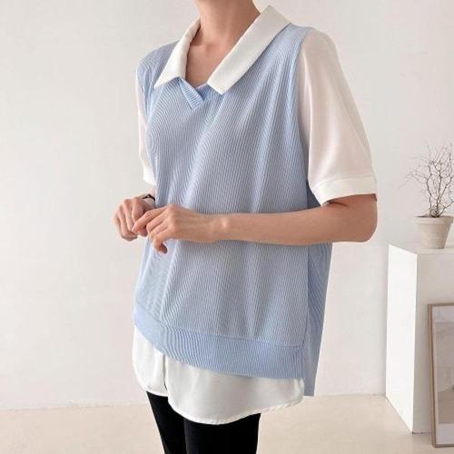 [다잇템][다잇템] 여자 오피스룩 골지 반팔셔츠 코디 브이조끼 티셔츠_20634379_588872