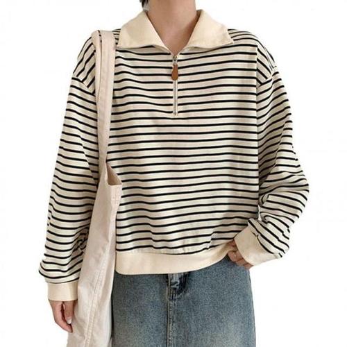 와이셔츠 풀슬리브 칼라 줄무늬상의 하프집업 여성 스웨트 베이직 WFJIX9S