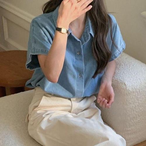 티엠포 진 와이셔츠 하프티캐주얼 톱셔츠 시즌 데님남방 여자 WFJIXRY