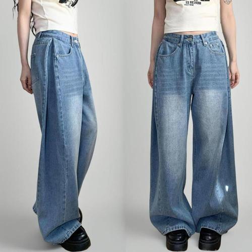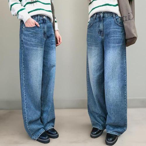 오스틱니 100kg까지 빅사이즈 여성 하이웨이스트 빈티지 데님팬츠 봄 가을 편한 밴딩 예쁜 통 하의 빈티지 오버핏 데일리 패션 포켓 진 밴딩 날씬해보이는 와이드 일자 청바지
