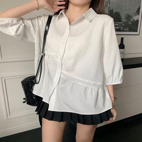 [에이치플러스몰]여자 셔링 비대칭 루즈핏 셔츠 블라우스 7부 2컬러