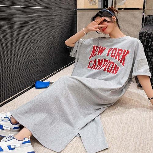 [셀러허브_여성트랜드패션]ONM 여자 그레이컬러 영문 레터링 루즈핏 트임 롱원피스