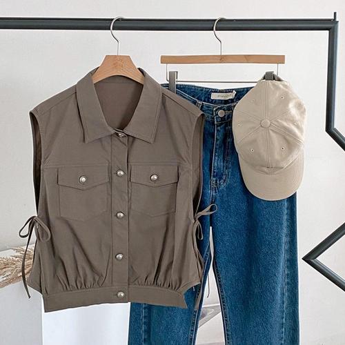 여성 카라넥 옆트임 리본 단추여밈 레이어드 조끼 BONG-WVS-4713-브라운