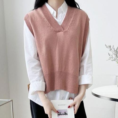 여성 국산 루즈핏 레이어드 V넥 옆트임 6컬러 니트 조끼 JLE-WVS-4295-핑크