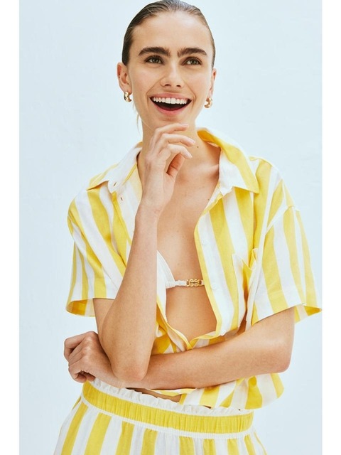 [에이치엔엠] 리넨 블렌드 셔츠 옐로/스트라이프 1261369002