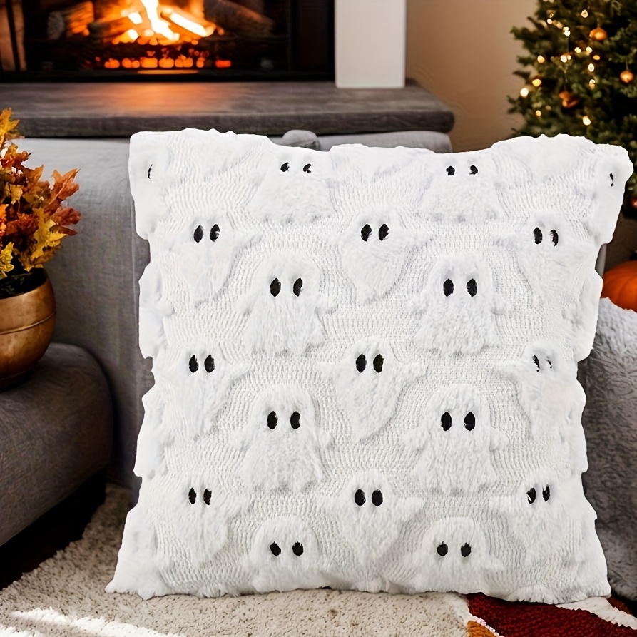 TEMU 1개 프렌치 컨트리 스타일 자수 플러시 쿠션 커버, 45x45cm, 오렌지 호박 & 화이트 고스트 디자인, 지퍼 클로저, 세탁기 사용 가능, 폴리에스터, 소파 침대 홈 팜하우스 장식용, 가을 할로윈 크리스마스 추수감사절 장식, 전기 필요 없음, 장식용 베개